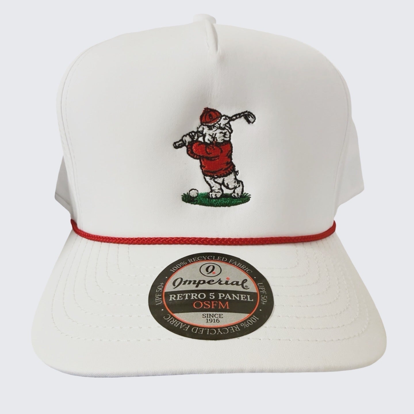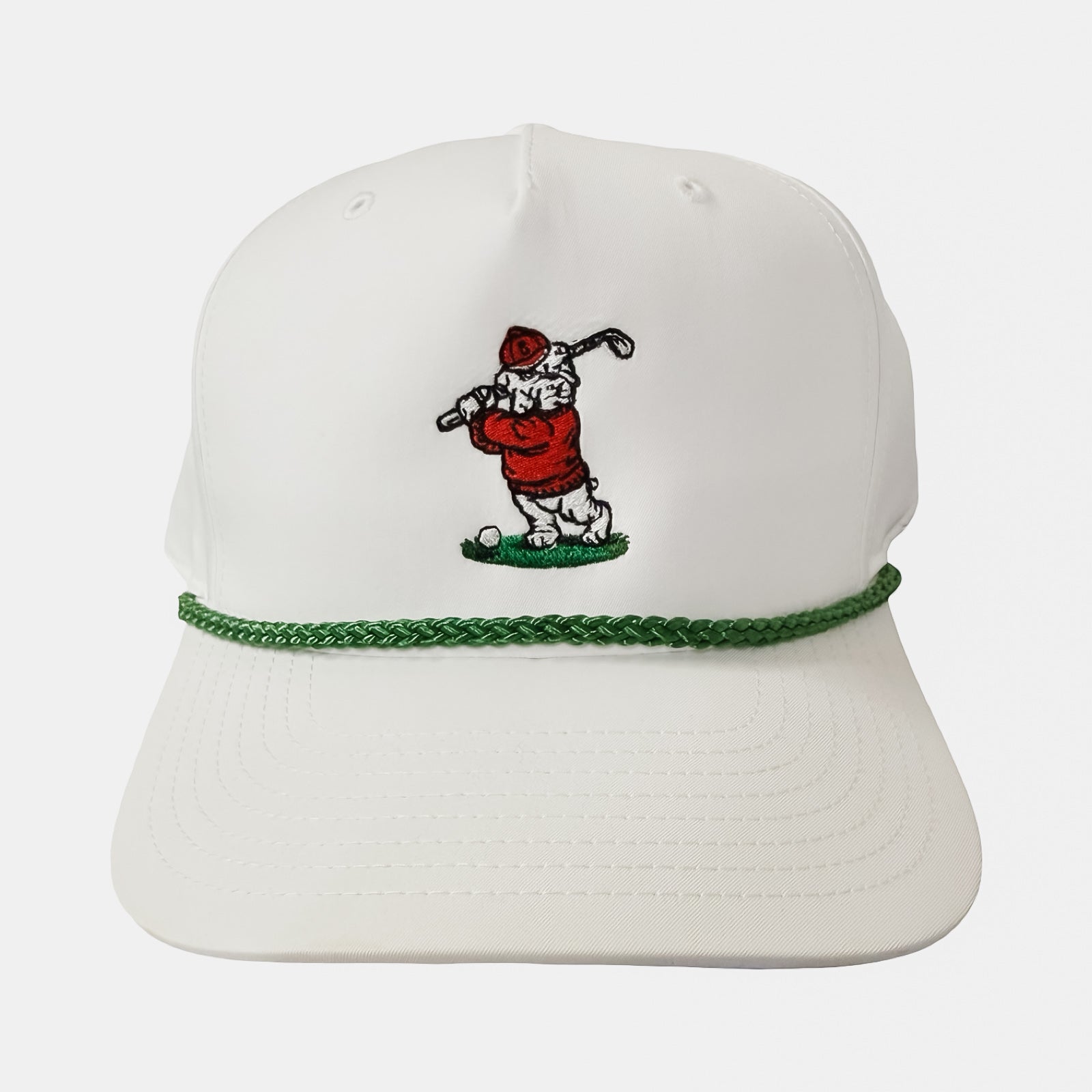 Tee up timeless style with this vintage-inspired rope hat featuring an embroidered bulldog golfer mid-swing. Designed on a crisp white retro 5-panel cap with a bold red rope detail, this hat blends classic golf aesthetics with collegiate charm.